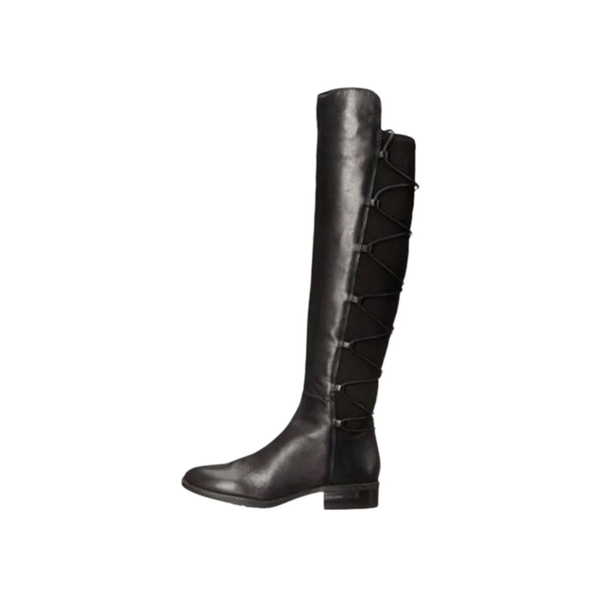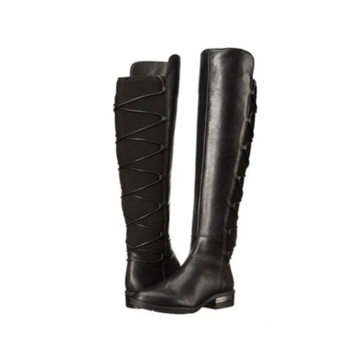 Riding boots by Vince Camuto offer stylish comfort with black leather and an over-the-knee lace-up design. Perfect for fashion-forward shoppers.