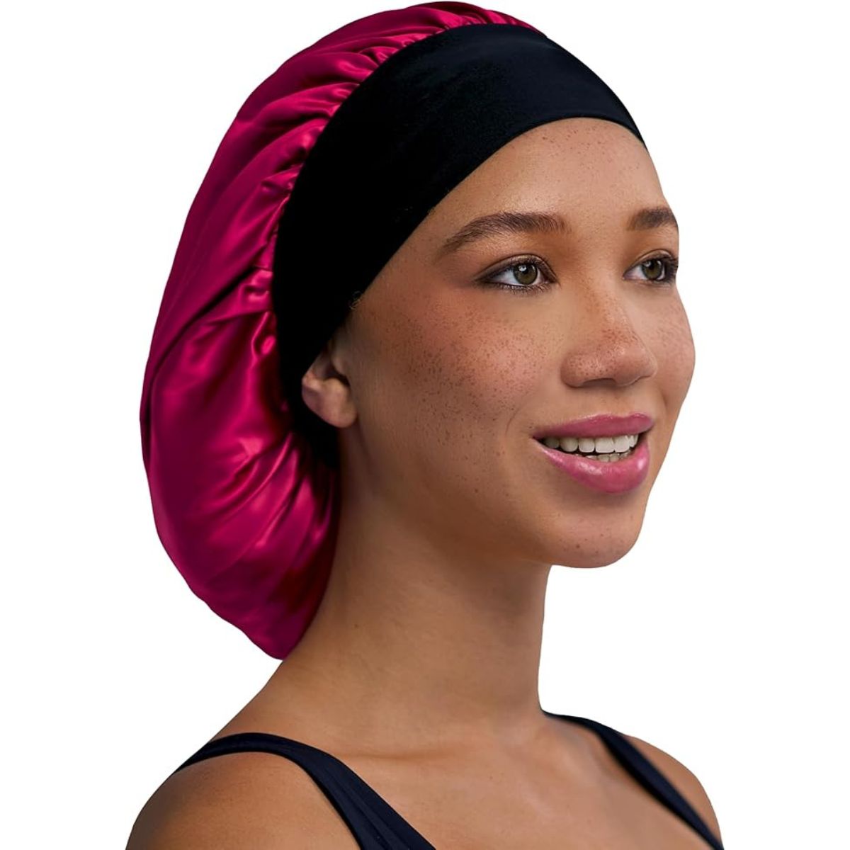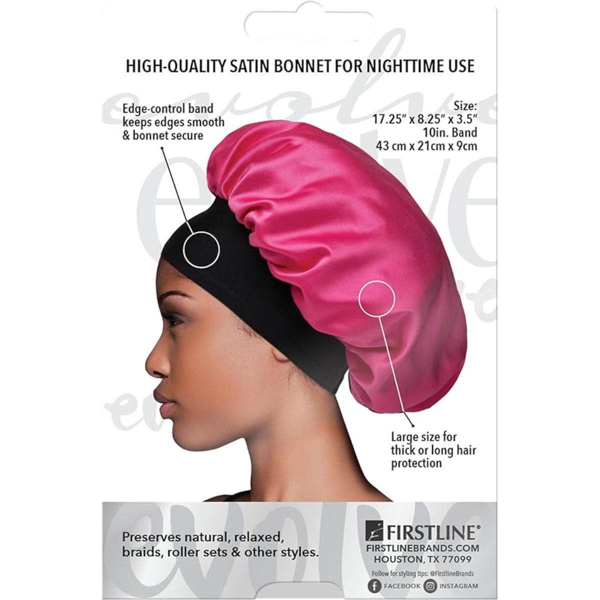 The satin bonnet from Firstline features a wide edge design that protects hair and keeps edges smooth all night. Perfect for maintaining healthy styles.