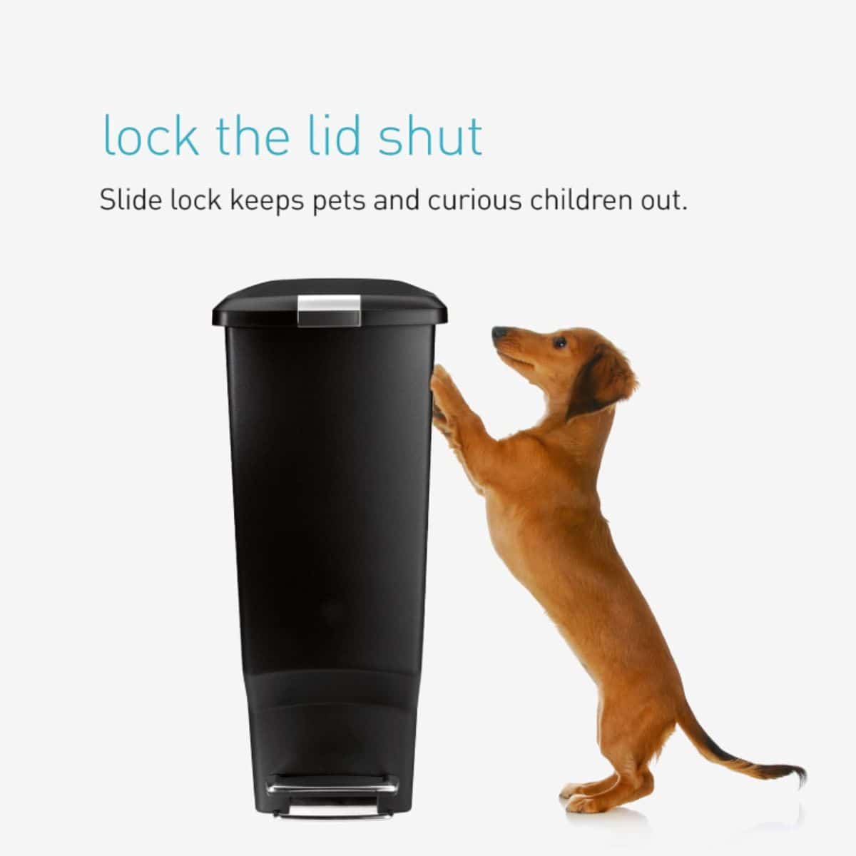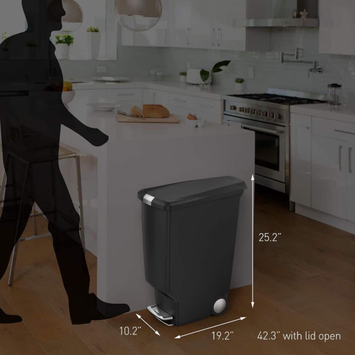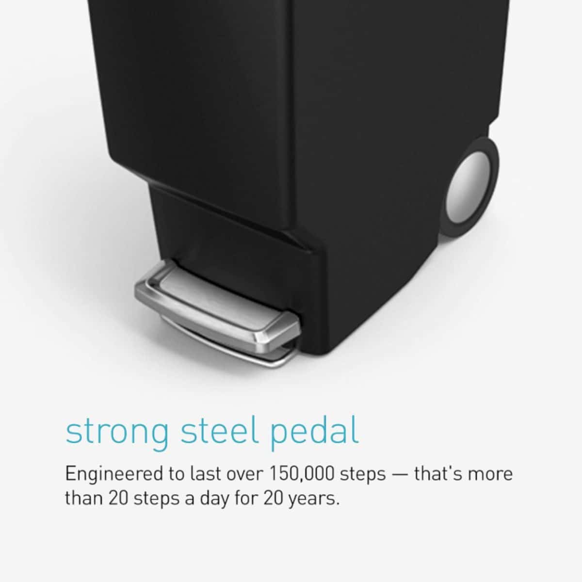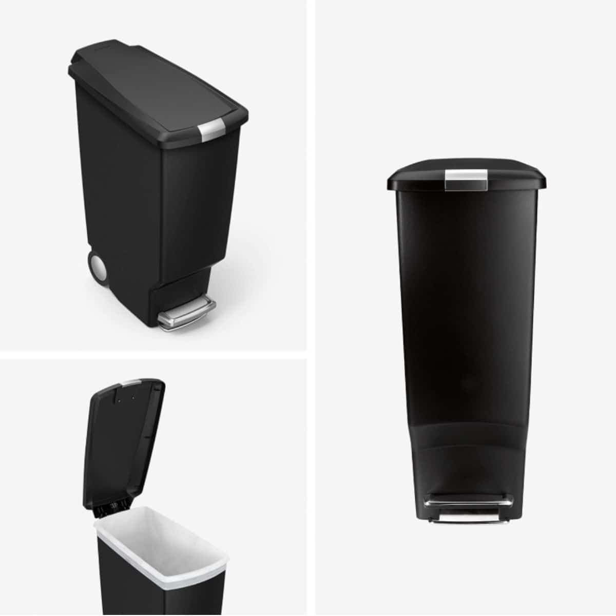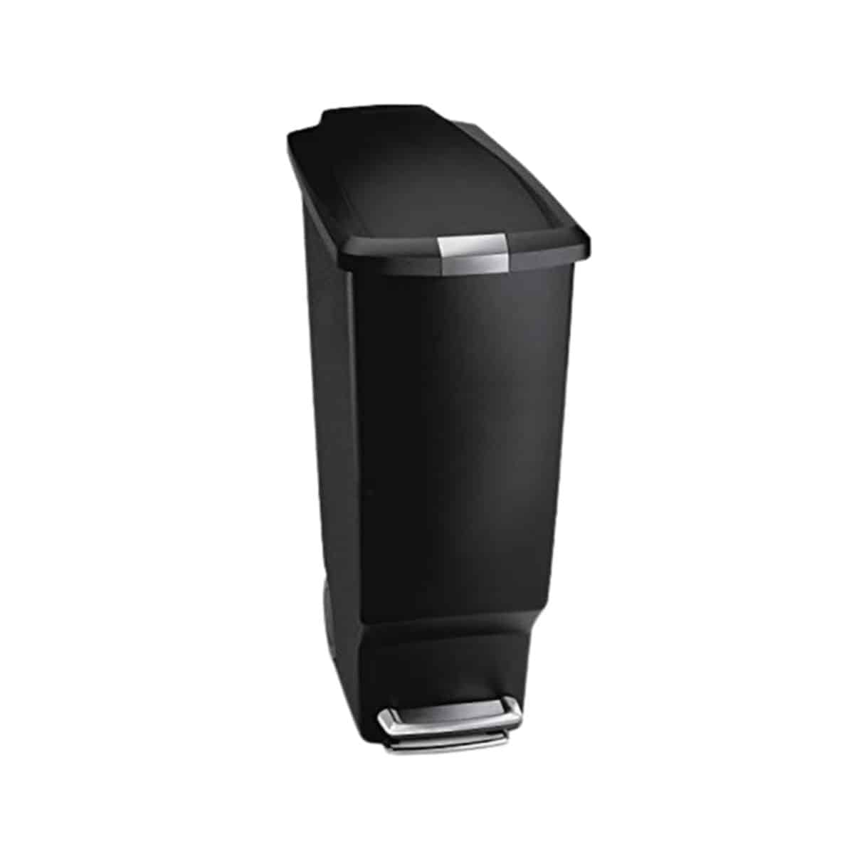 The simplehuman 40 liter slim kitchen step trash can offers a space-saving design with a secure slide lock. Perfect for keeping your kitchen neat and tidy.