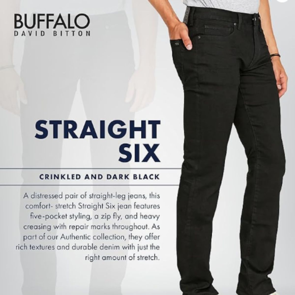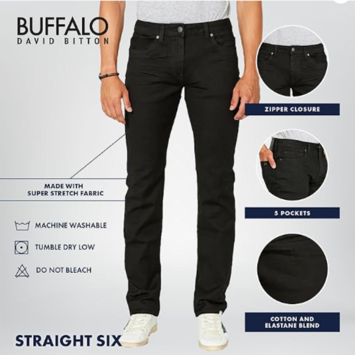Slim straight stretch jeans by Buffalo offer a classic fit with sustainable cotton. Perfect for everyday wear with a narrow cuff for style.