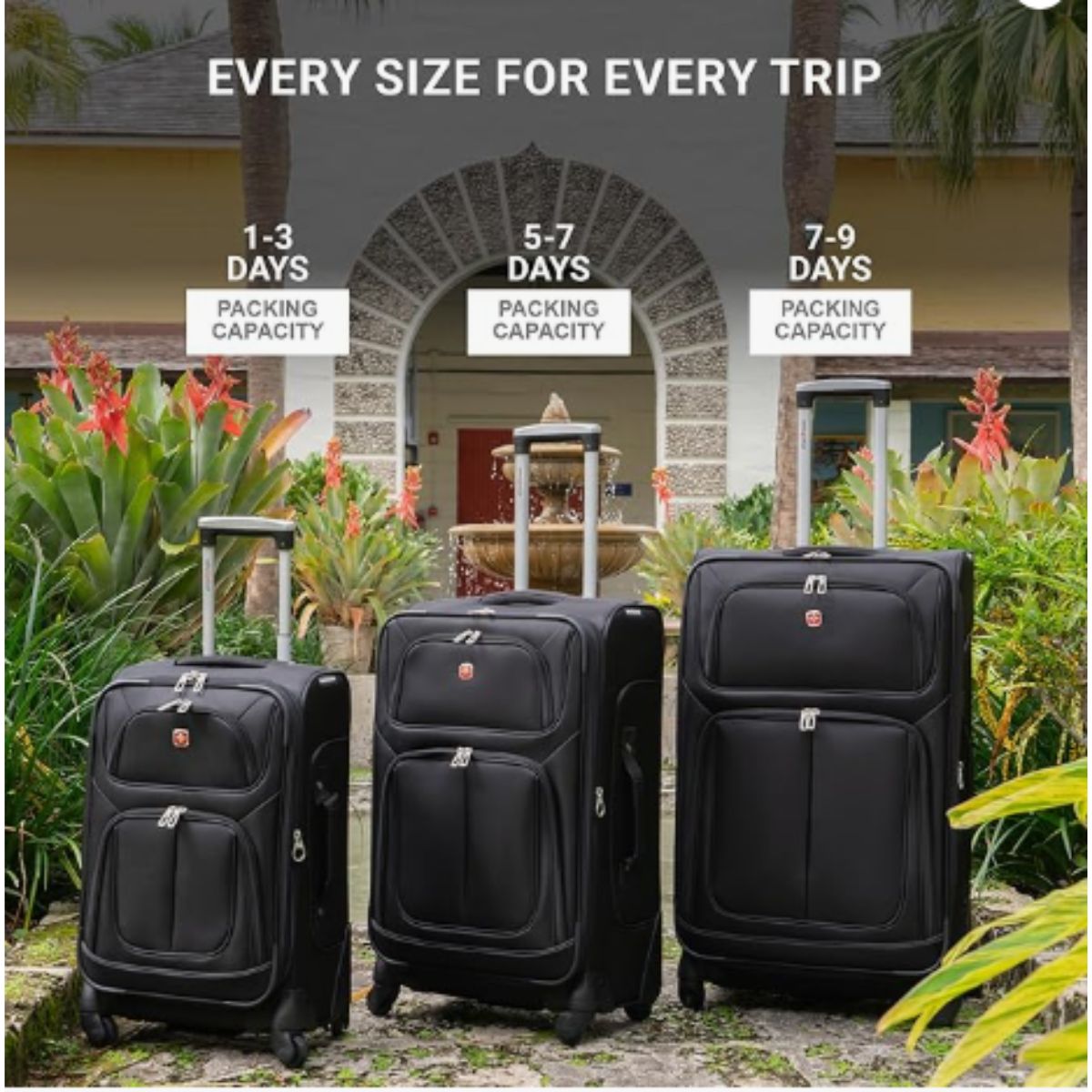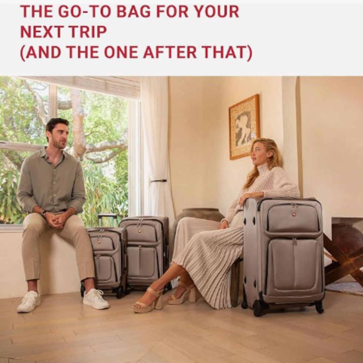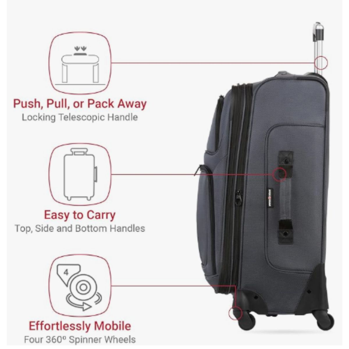 Softside expandable luggage by SwissGear features 360-degree spinner wheels for easy mobility. Durable and spacious, perfect for all your travel needs.