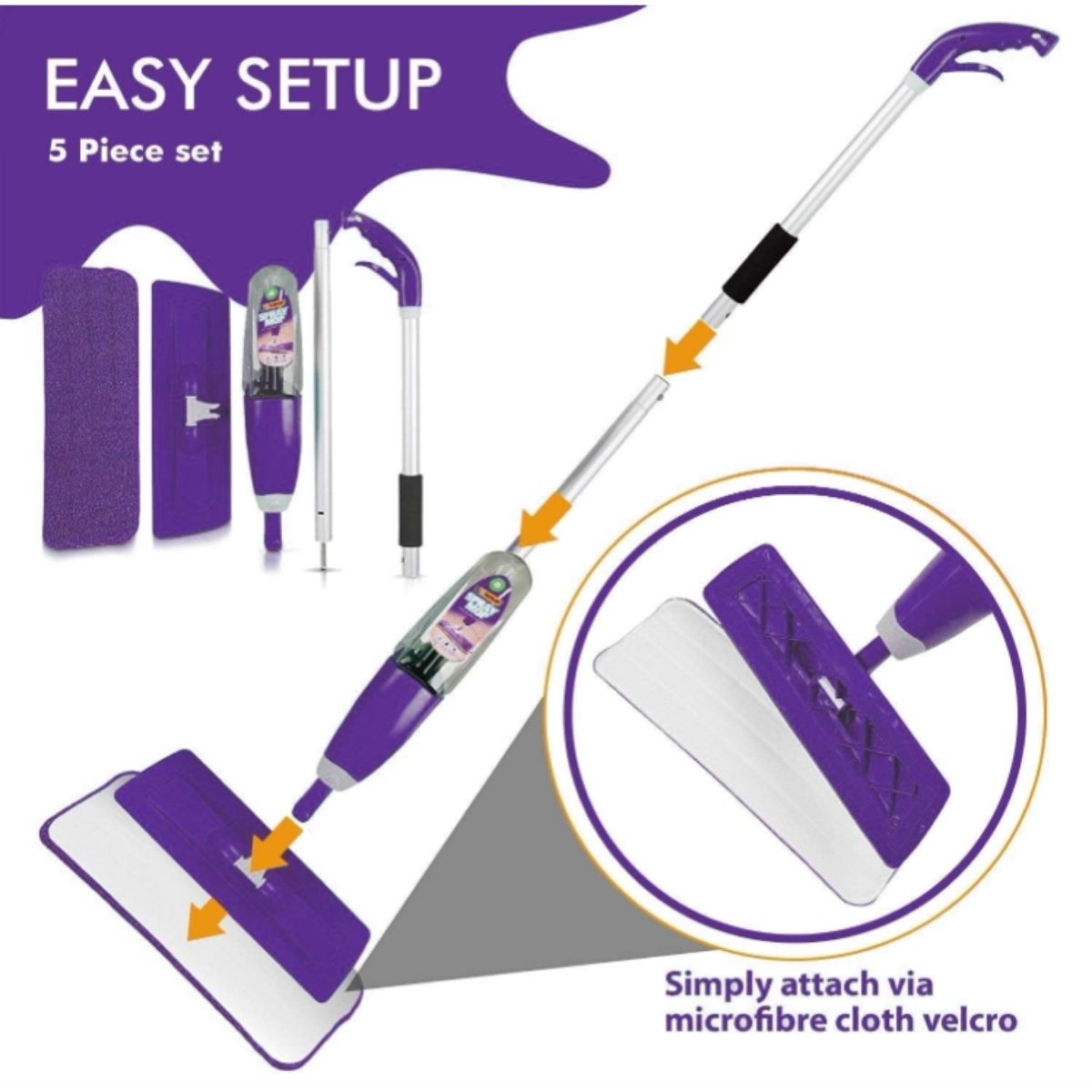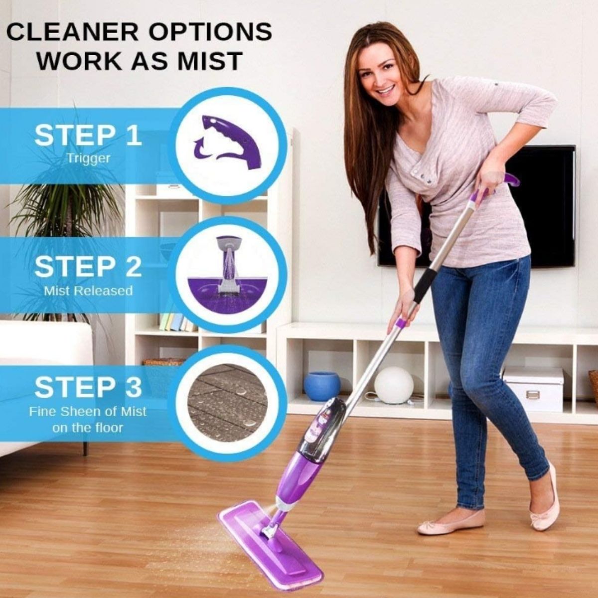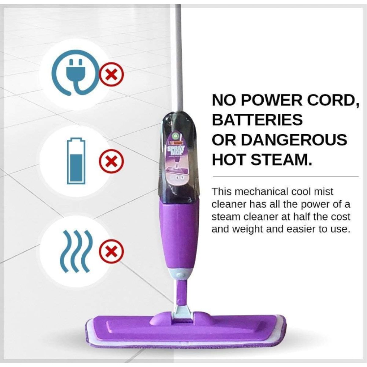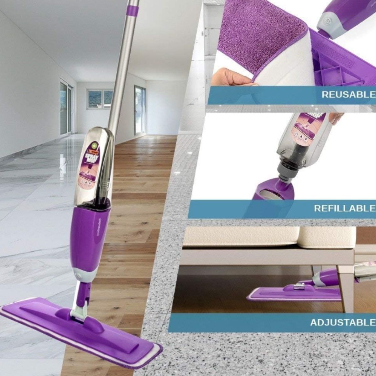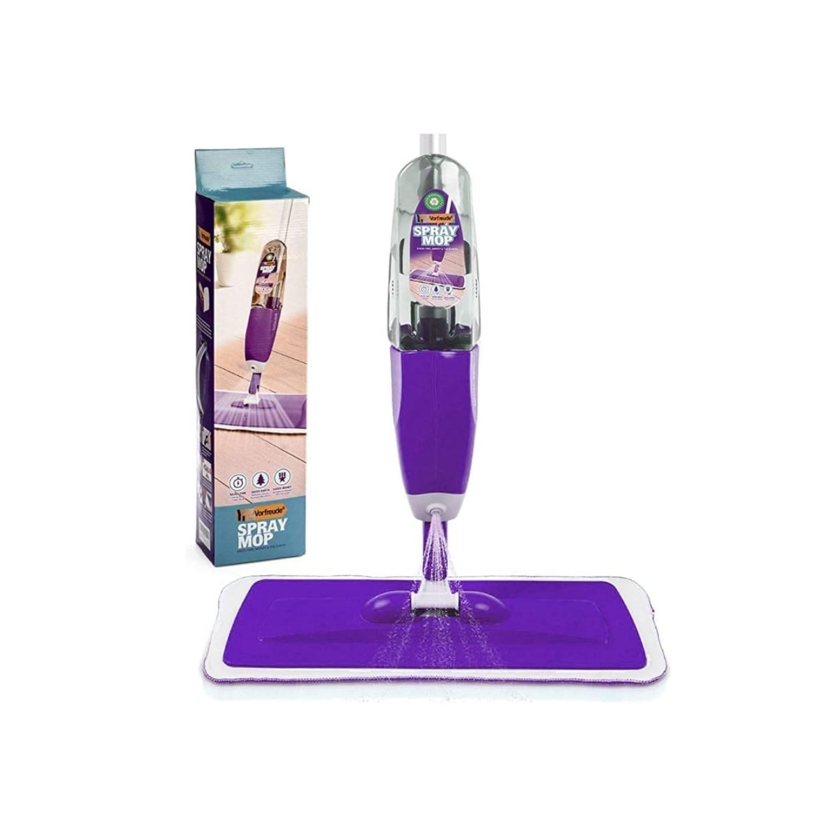 Spray mop by Vorfreude offers powerful cleaning on hardwood, tile, laminate, and more. Includes a washable microfiber pad and refillable bottle for easy use.