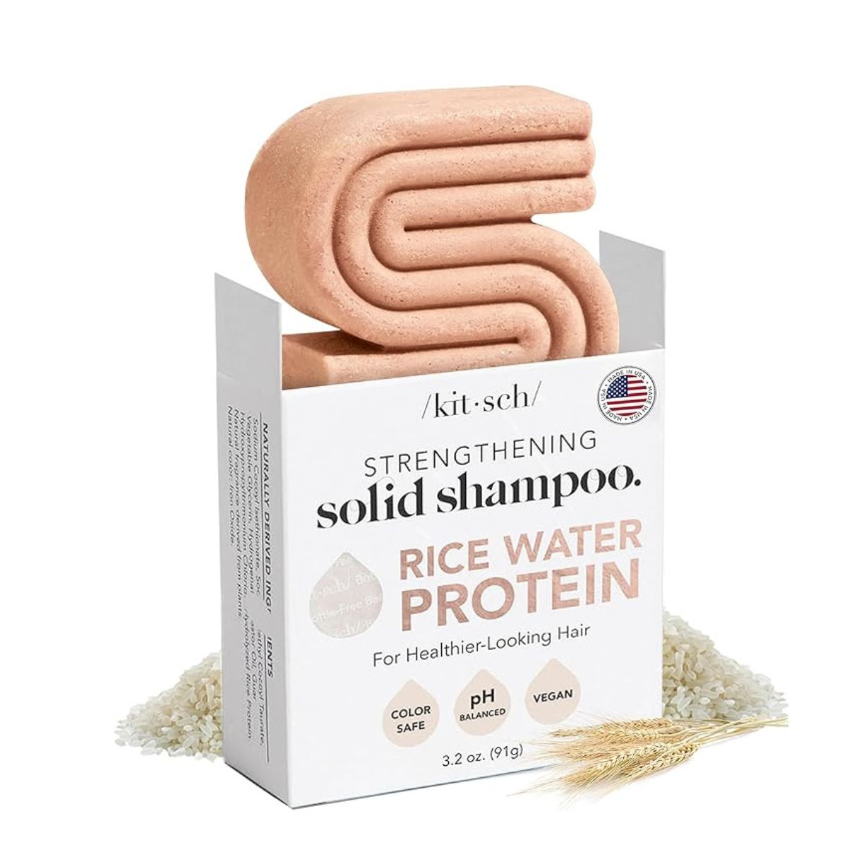 Strengthening solid shampoo bar by Kitsch nourishes your hair naturally with rice water protein and mandarin. Perfect for all hair types and eco-friendly care.