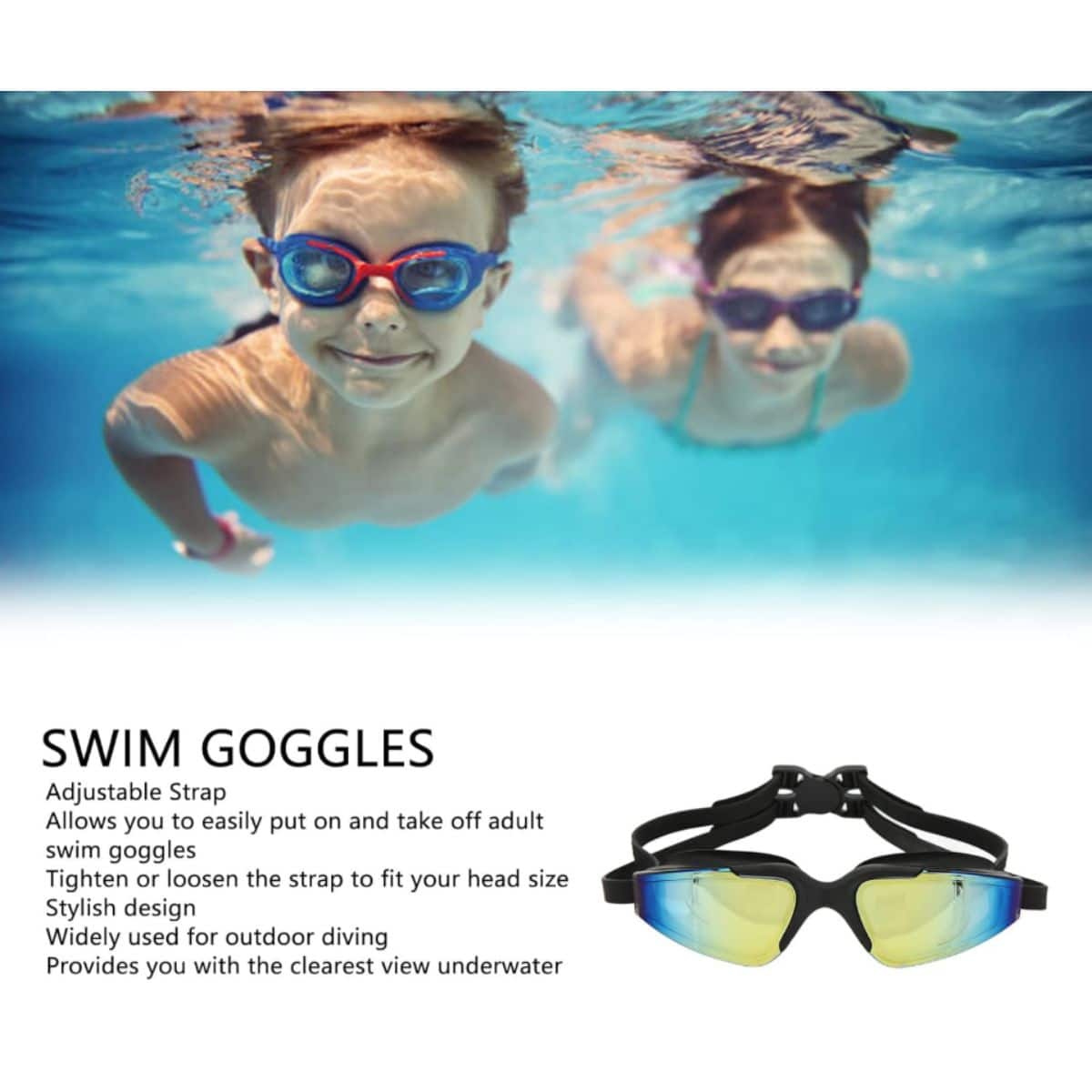Swim goggles by TOPINCN offer a wide view and adjustable back strap for comfort. Ideal for clear underwater vision during outdoor diving.