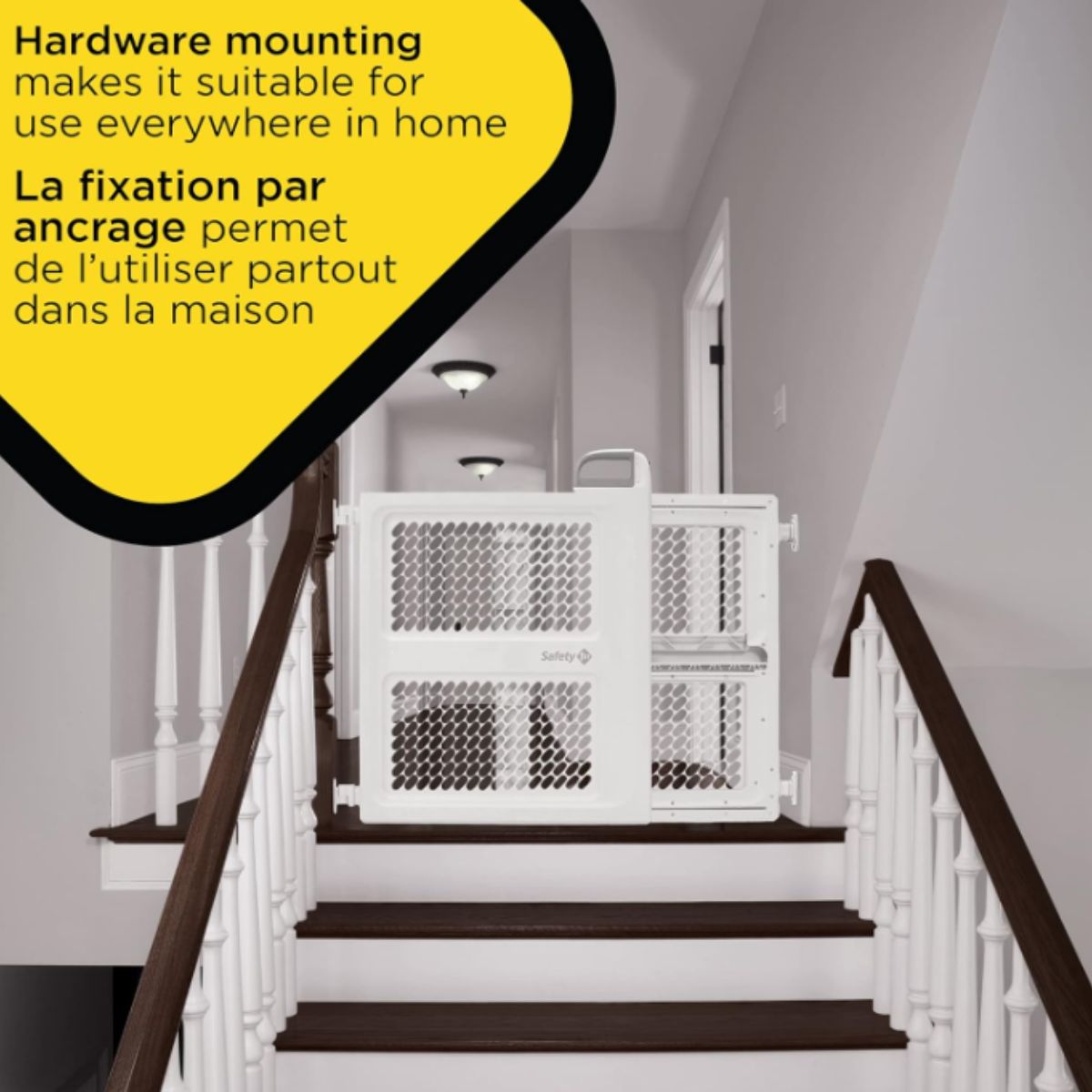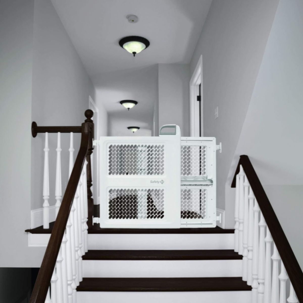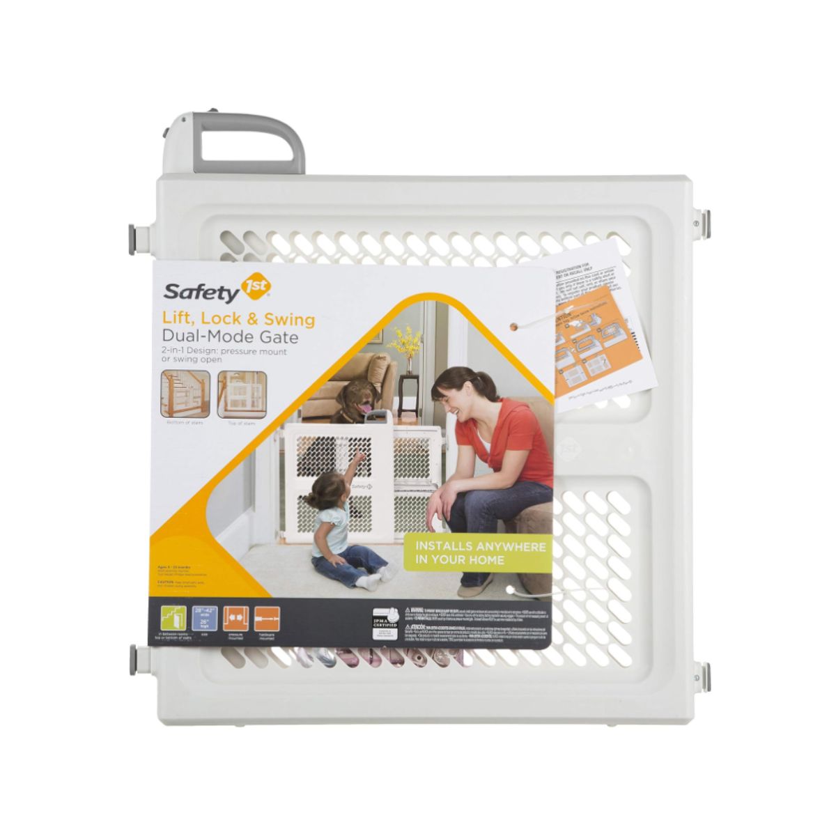Swing safety gate by Safety 1St offers pressure or hardware installation for secure spaces. Perfect for hallways and stairways.