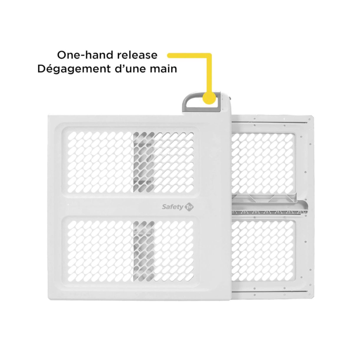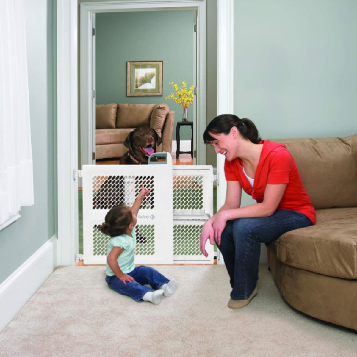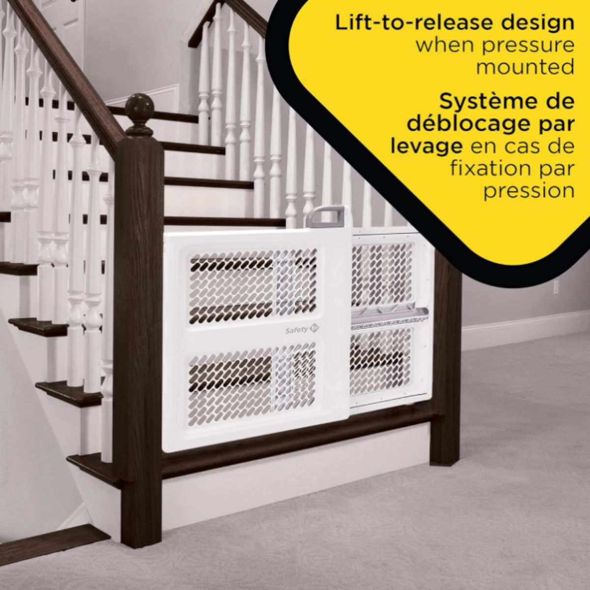 Swing safety gate by Safety 1St offers pressure or hardware installation for secure spaces. Perfect for hallways and stairways.