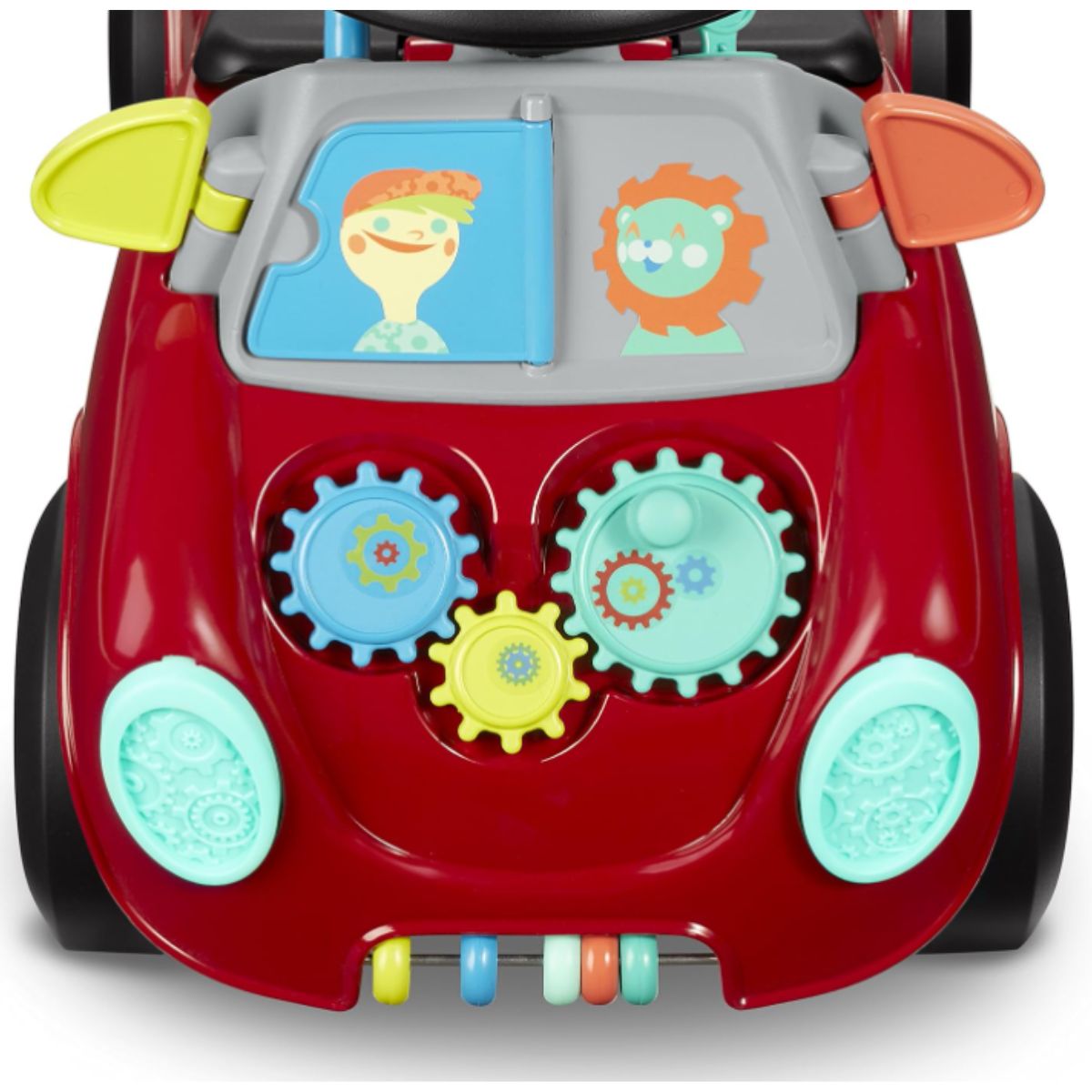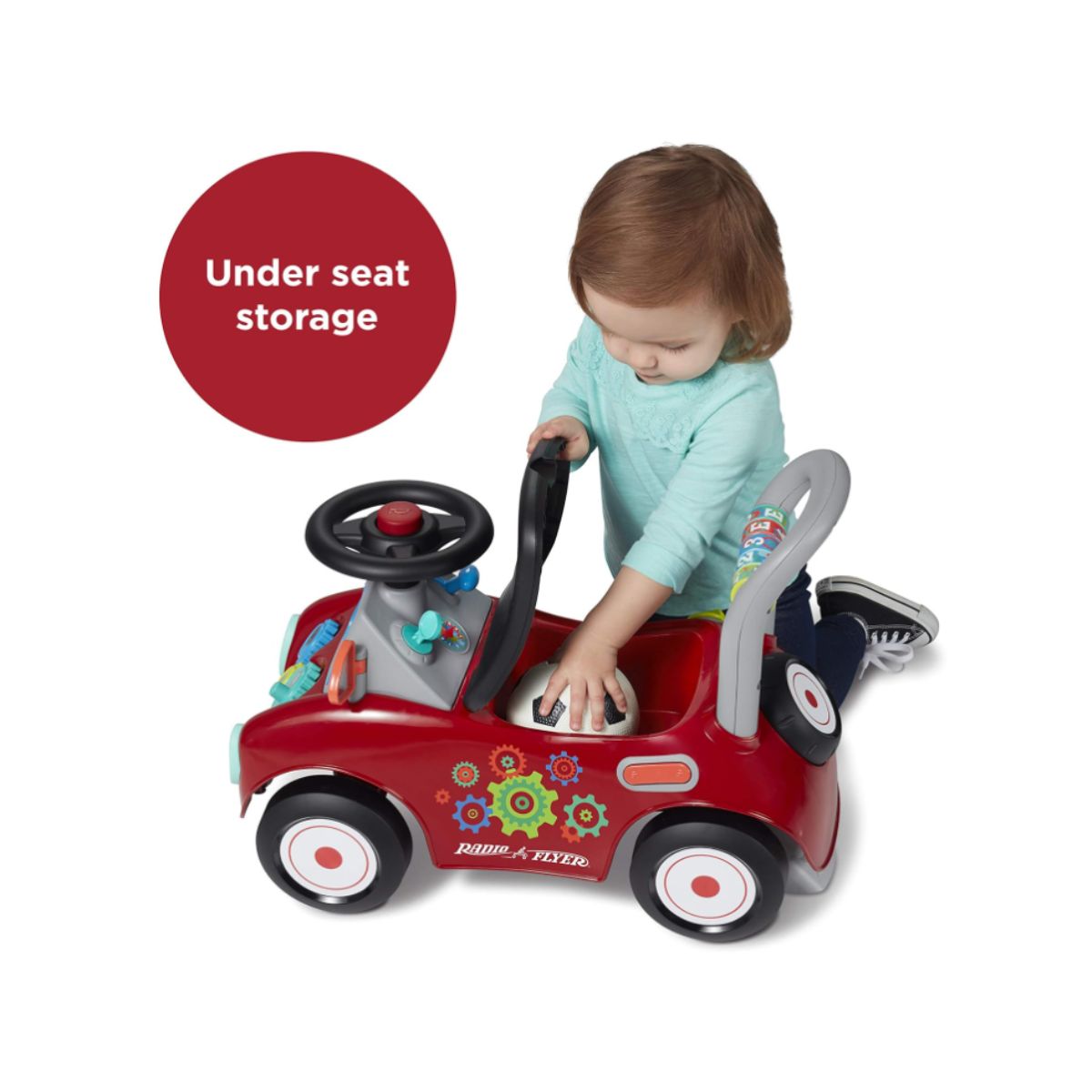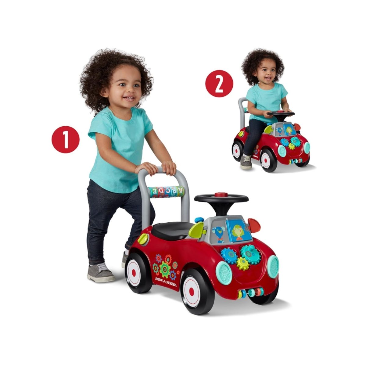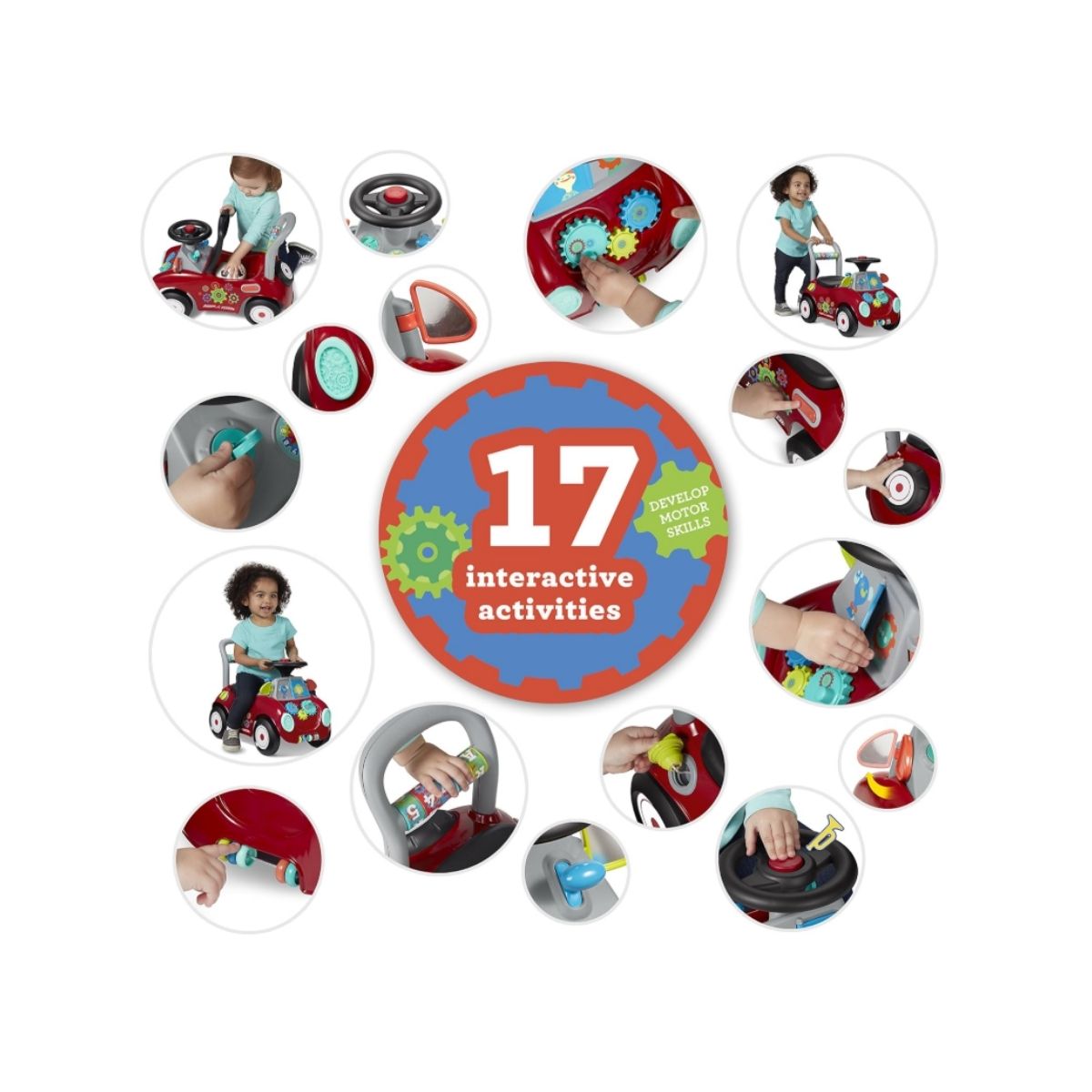 The toddler ride on toy by Radio offers 17 fun sensory activities to engage your child. Perfect for ages 1-3 to develop motor skills and balance.