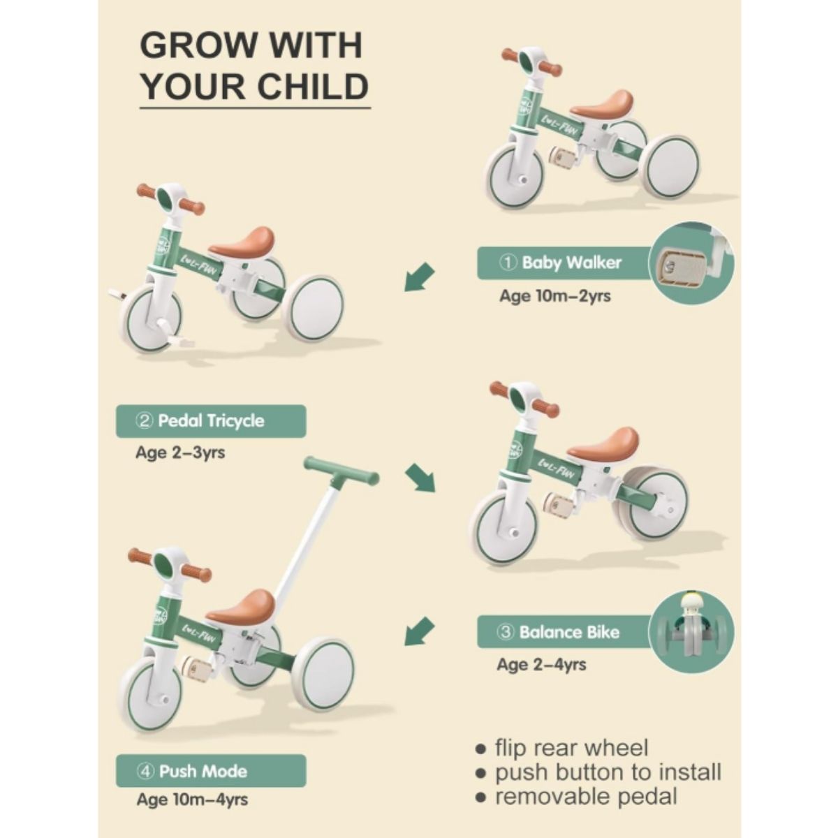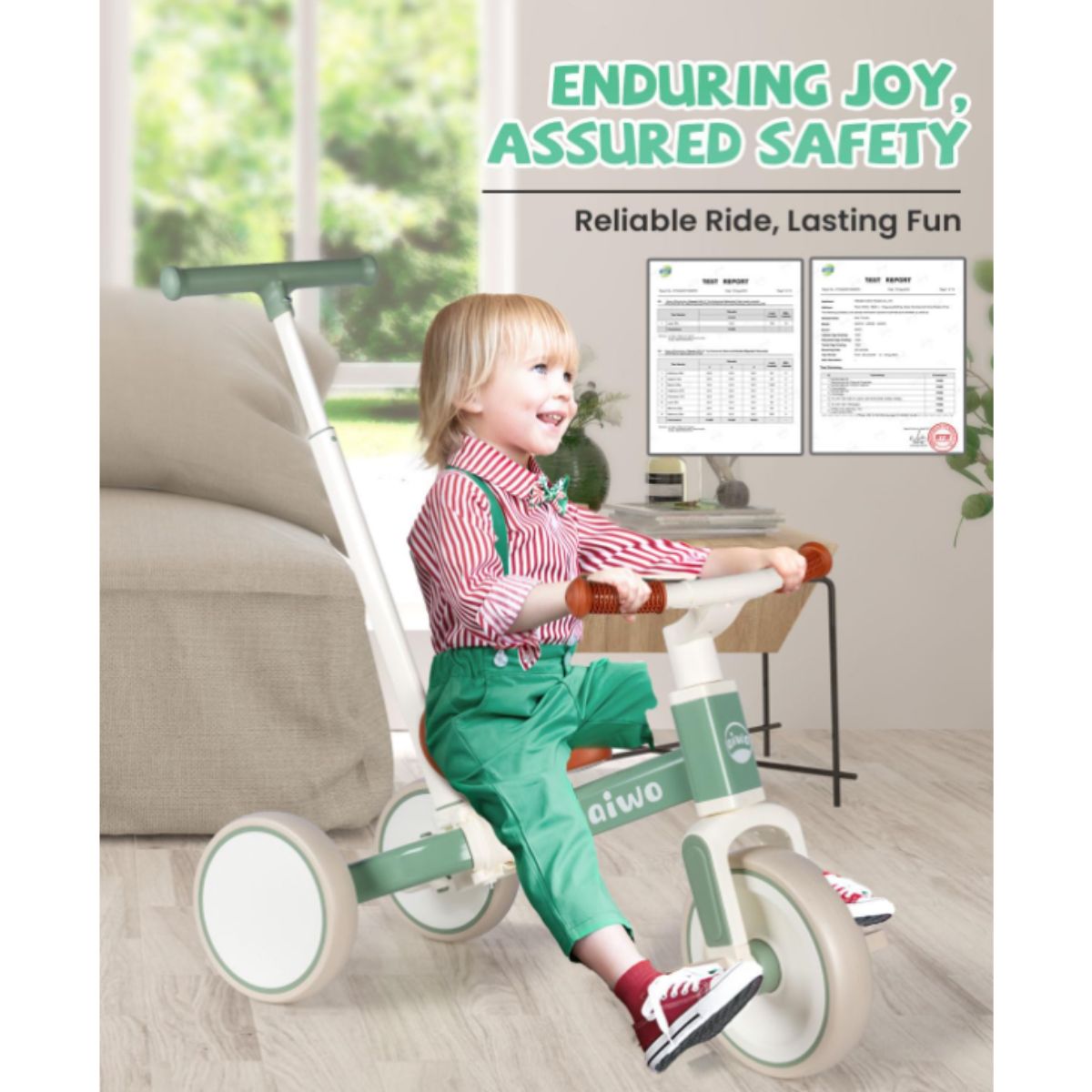 Toddler tricycle by Aiwo offers 5-in-1 versatility for kids aged 1 to 4. Perfect for growing toddlers, this safe and durable tricycle adapts as your child learns to ride.