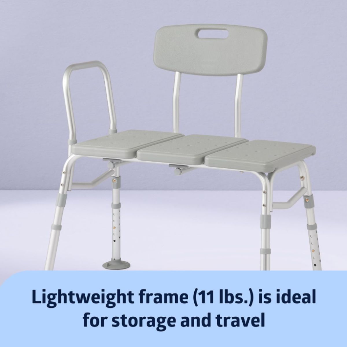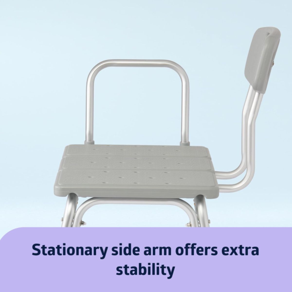 The transfer bench with back by Medline offers stable and safe bathing support. Designed with suction cup feet and side arm for extra stability.