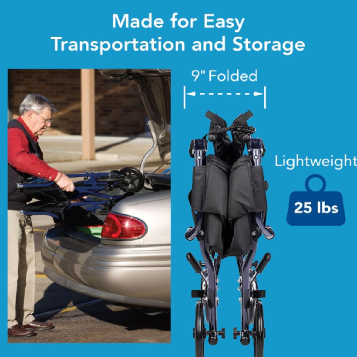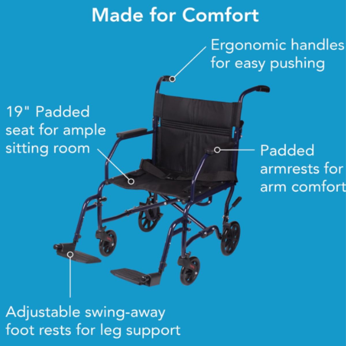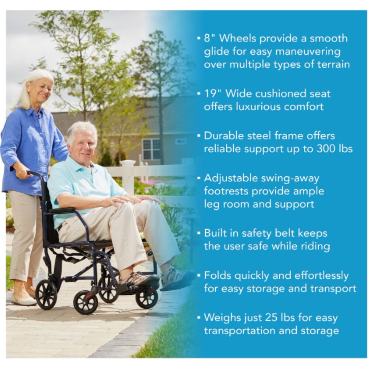 The transport wheelchair by Carex offers a comfortable and convenient way to transport individuals. Featuring a 19-inch seat and easy folding for compact storage.