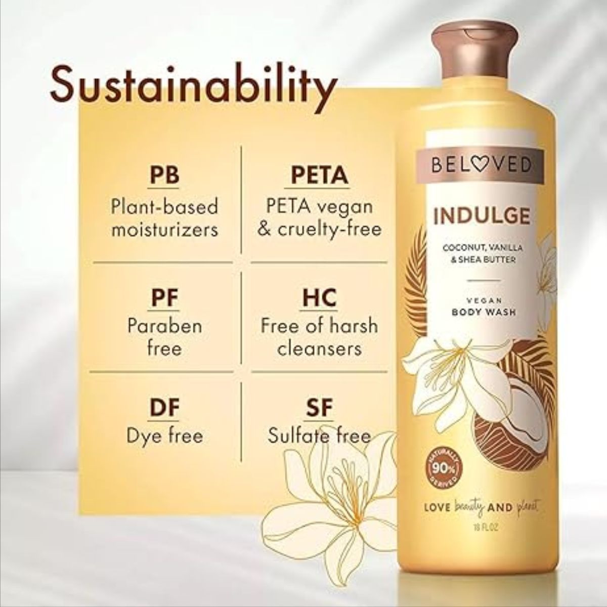 Vegan body wash by Beloved featuring coconut, vanilla and shea butter nourishes and moisturizes dry skin while creating a tropical lather.