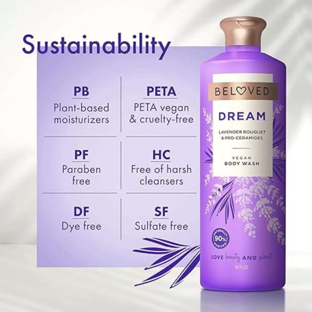 Vegan body wash by Beloved offers a gentle cleanse with soothing lavender bouquet and nourishing pro-ceramides. Perfect for all skin types.