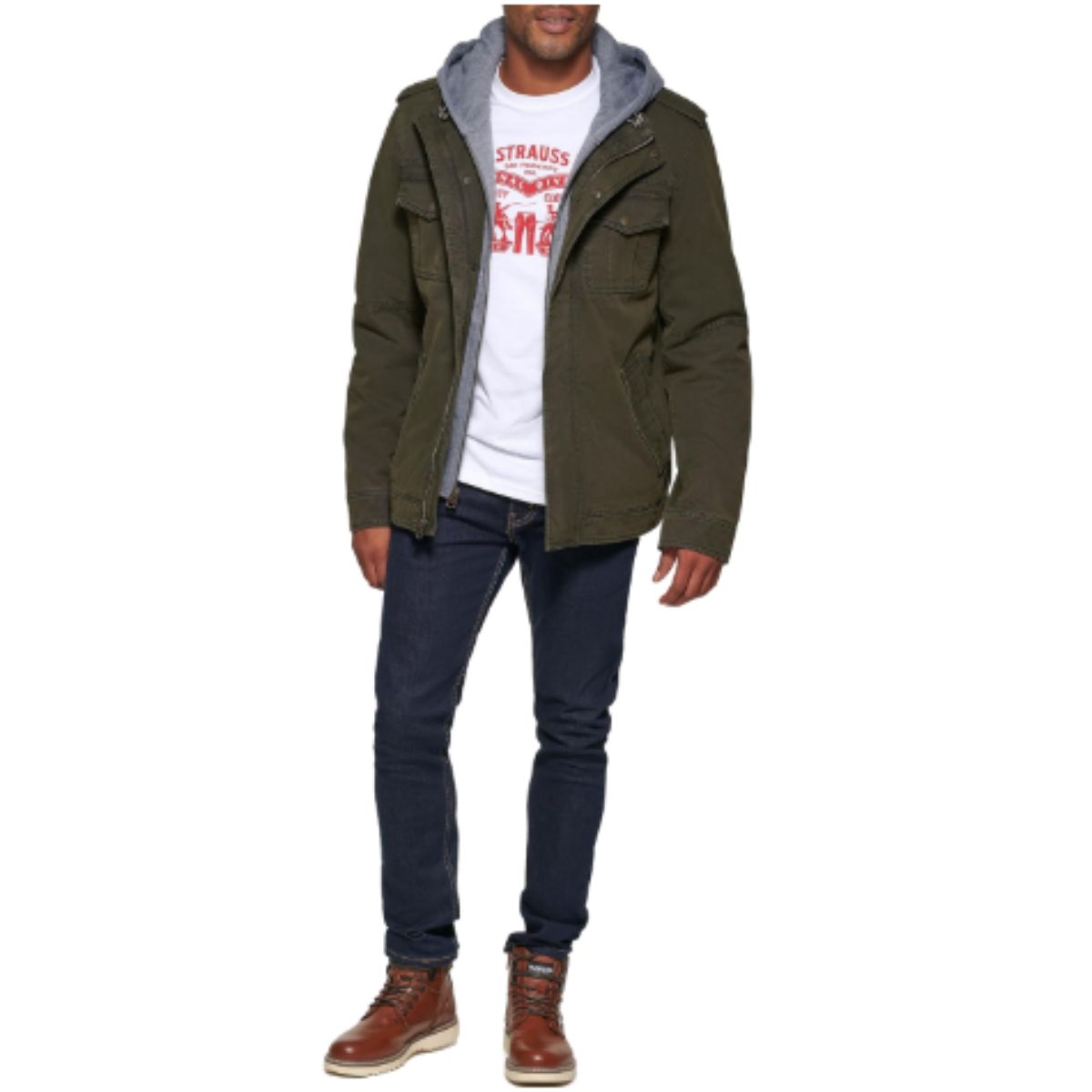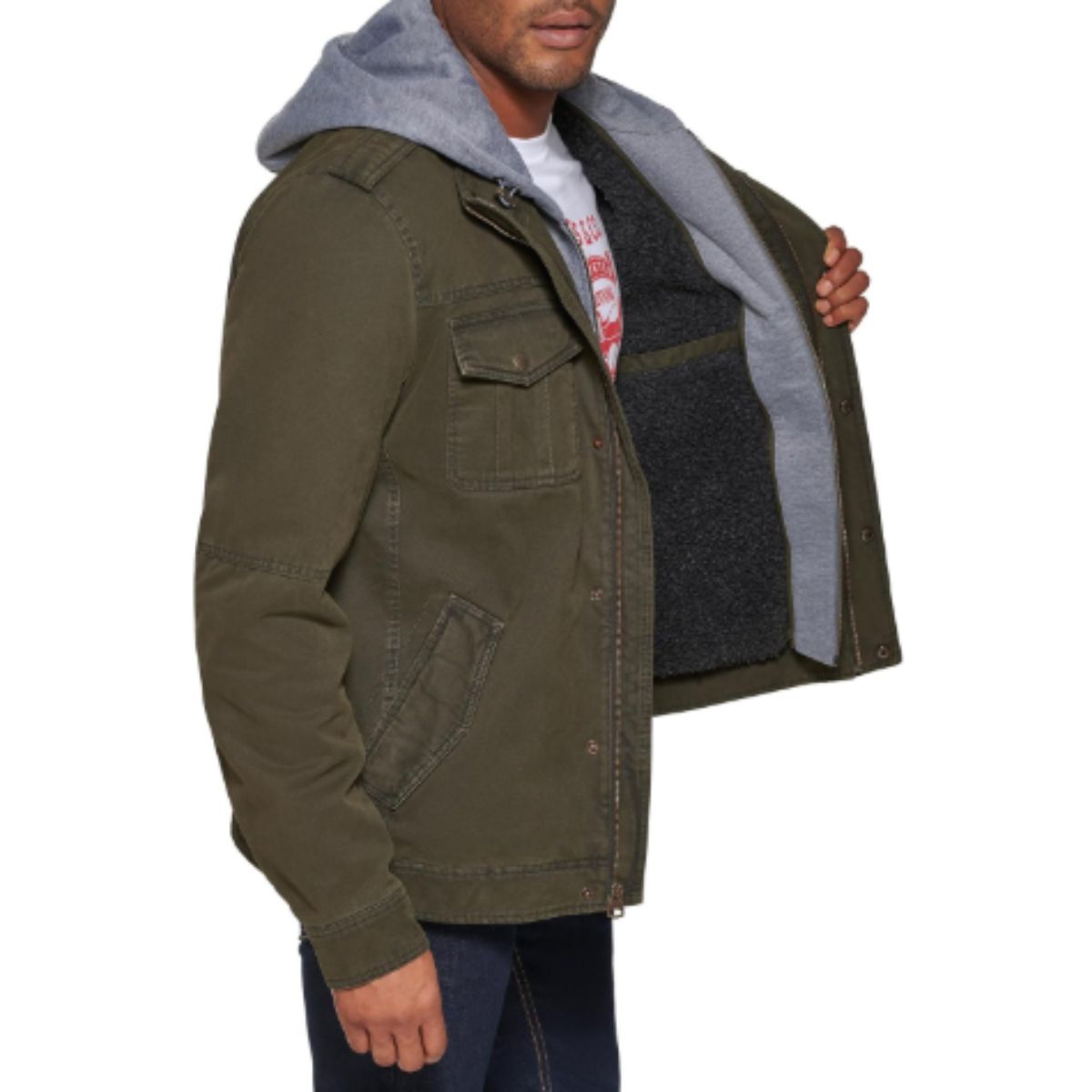 The washed cotton military jacket from Levi’s offers versatile style and warmth with its removable hood and Sherpa lining. Perfect for colder weather.