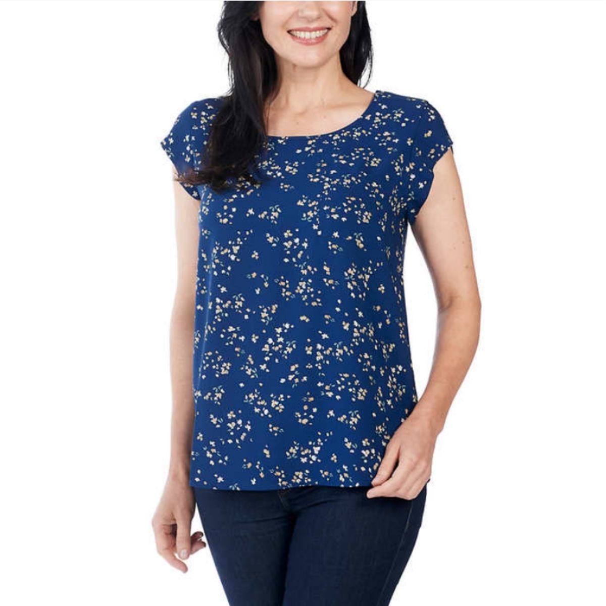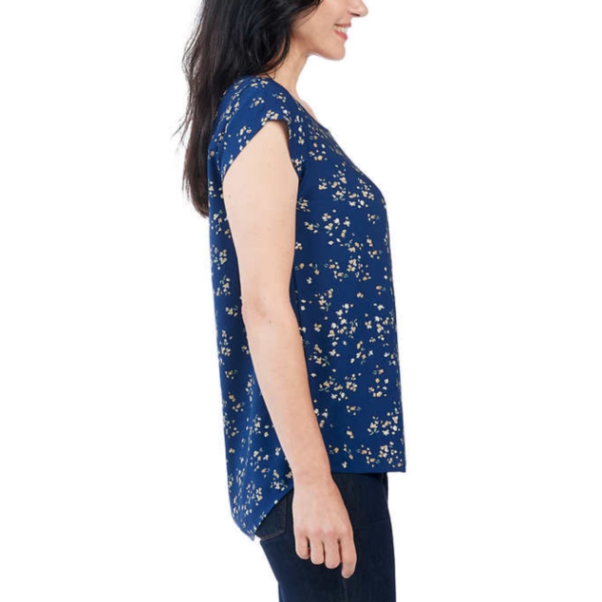 Women short sleeve sweater by Dalia features a floral print and convenient front pocket. Comfortable and stylish for everyday wear.